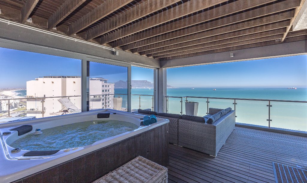 This stunning 208sq meter double-level apartment with majestic views is situated on the 11th and 12th floor. It has 4 bedrooms with built-in cupboards, en-suite bathrooms and flat-screen TVs in 2 of the bedrooms. The spacious lounge and the 2nd smaller lounge with bar both have flat-screen TVs. The kitchen is well equipped and forms part of the open-plan lounge and dining area with sliding doors leading out onto the balcony. The balcony on the 1st level has a Jacuzzi and seating/lounging area and amazing uninterrupted views over the ocean and Table Mountain. A truly magnificent place to spend time with special friends and family. Full DSTV package. Secure and fast Wi-Fi.