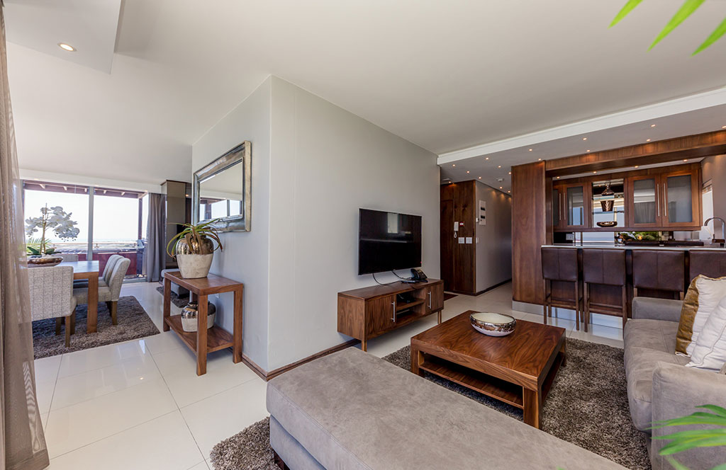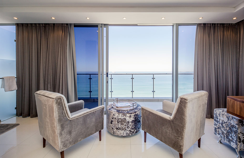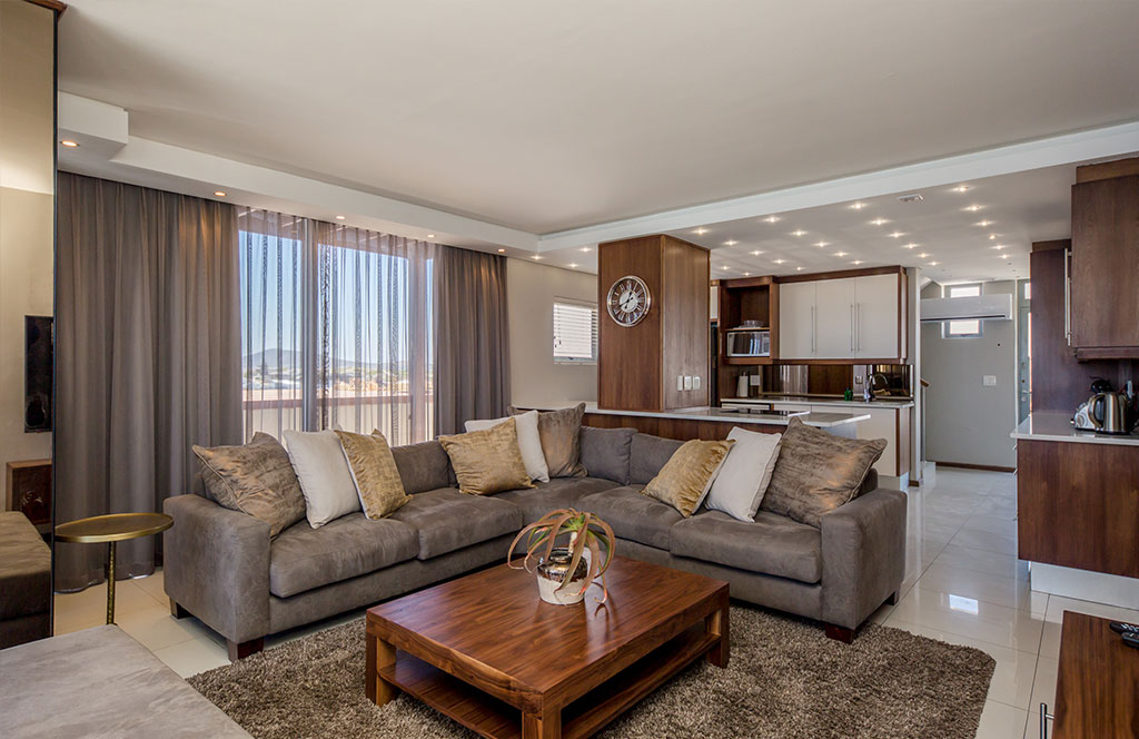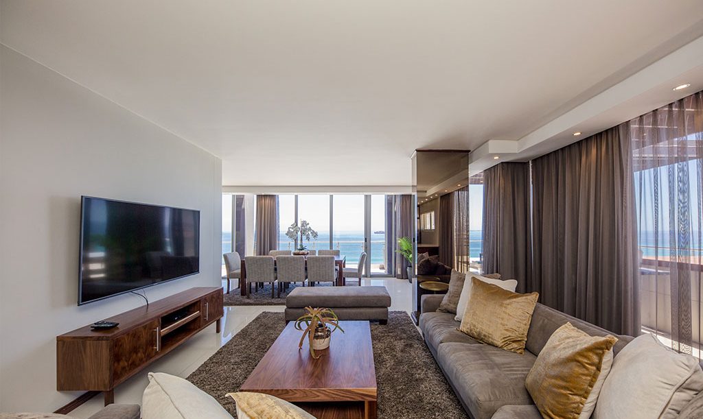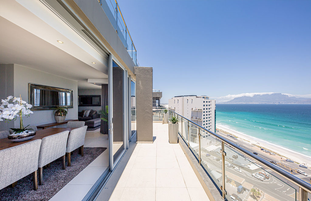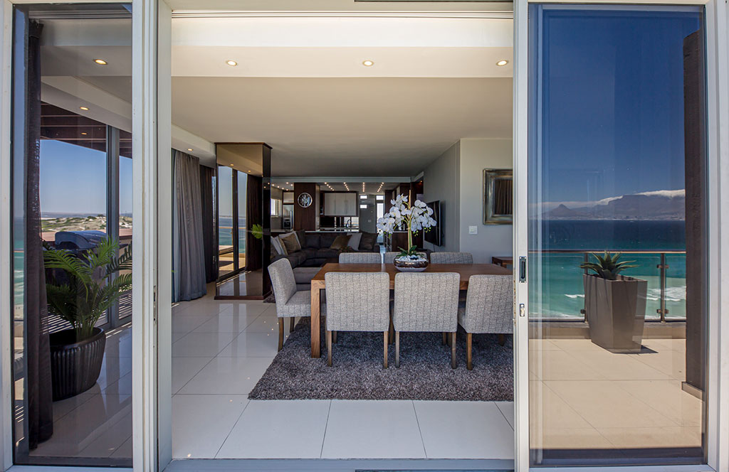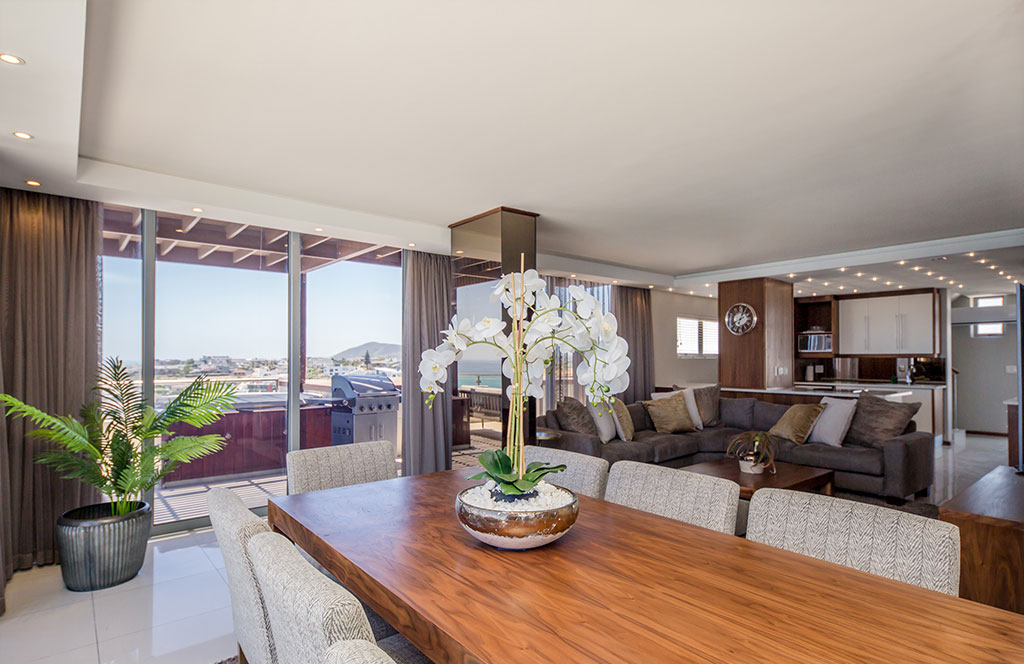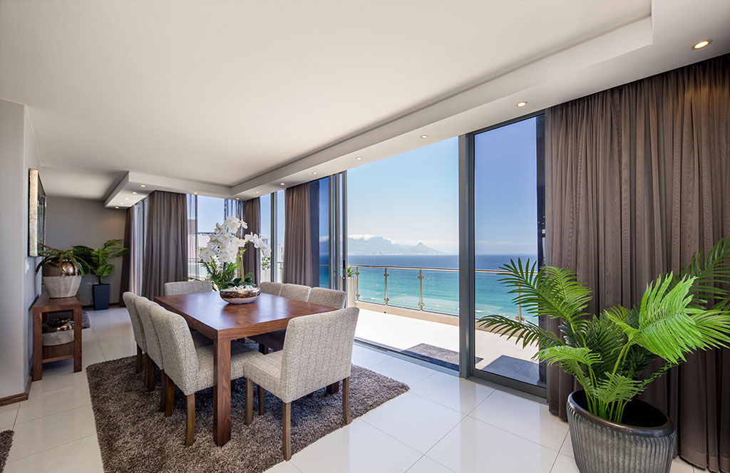 - Air-conditioned open plan living area with lounge and an 8-seater dining room table where you get the best views in Cape Town of Table Mountain and the ocean.